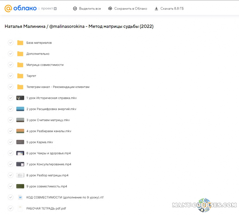 Вы находитесь на странице товара «Наталья Малинина / @malinasorokina - Метод матрицы судьбы», это материал 2022 года, который, мы надеемся, принесет вам пользу. Данный курс расположен на платформе «Облако Mail».Скриншоты с платформы на которой расположены материалы вы можете найти выше. В нашем магазине курсы доступны по самым выгодным ценам. Вы получаете этот курс, купив в нашем магазине MANY-COURSES.NET, с огромной скидкой, всего 1100 рублей. Обучающий курс входит в рубрику «Эзотерика и оккультизм», вы можете поискать другие сливы курсов в этой рубрике. В нашем магазине Вы найдёте ещё много курсов от автора «Наталья Малинина», достаточно ввести в поиск имя автора.