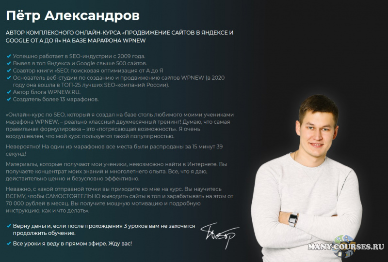 12-летний опыт успешного эксперта-практика по SEO-продвижению Петра Александрова, автора легендарного марафона WPNEW! Освойте SEO с нуля и начните выводить сайты в ТОП Яндекса и Google уже через 2,5 месяца.