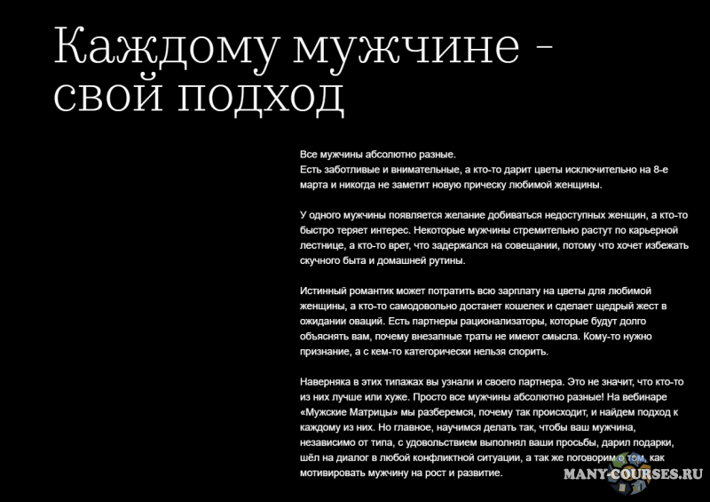 Это авторский вебинар! Здесь не будет скопированной или пересказанной заезженной информации. Программа вебинара «Мужские Матрицы» не имеет аналогов, а так же является понятным и рабочим алгоритмом, который проверен сотнями женщин.